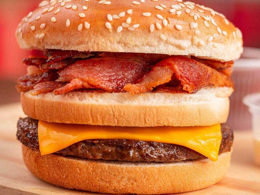 Pão de hambúrguer 90grBife de hamburguer sabor picanha 90 grqueijo pratobanana prata na chapabaconalface e tomate