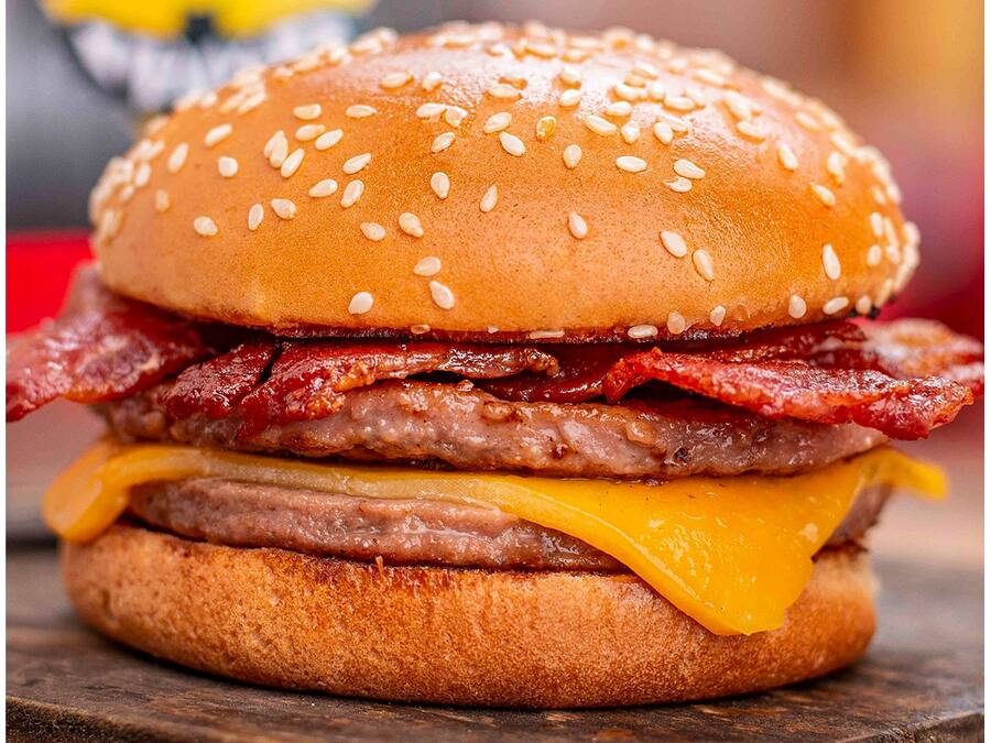 Pão pequeno 65 gr1 bife de hamburguer 56grqueijo cheddartiras de baconmolho Cheese